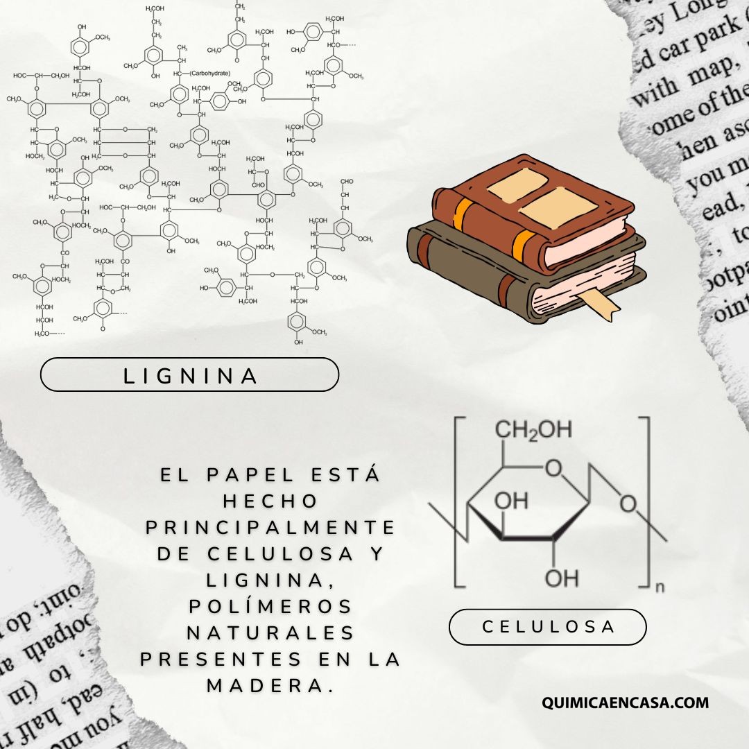 - El papel está hecho principalmente de celulosa y lignina, polímeros naturales presentes en la madera.
