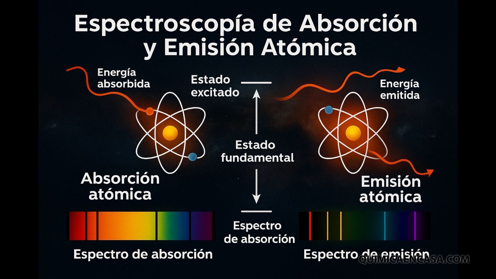 • Absorción atómica: el átomo absorbe energía (luz) y sus electrones saltan a niveles superiores.